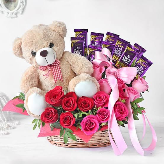 Basket of Roses, Cadbury's Chocolates & Teddy